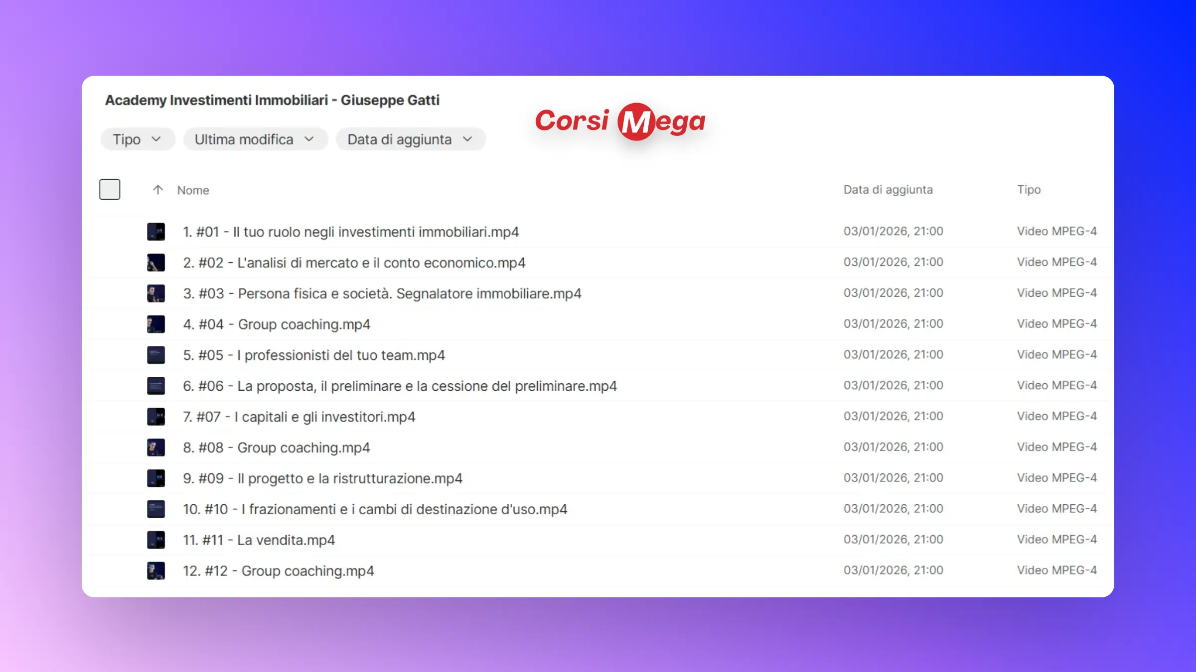 NOTA: salvo dove specificato, non riceverai i materiali cartacei, l’accesso ai gruppi social, dirette live non registrate, licenze non condivisibili, consulenze o l’assistenza da parte dell’autore del corso. Per maggior informazioni ti invitiamo a consultare le FAQ o a contattarci direttamente.