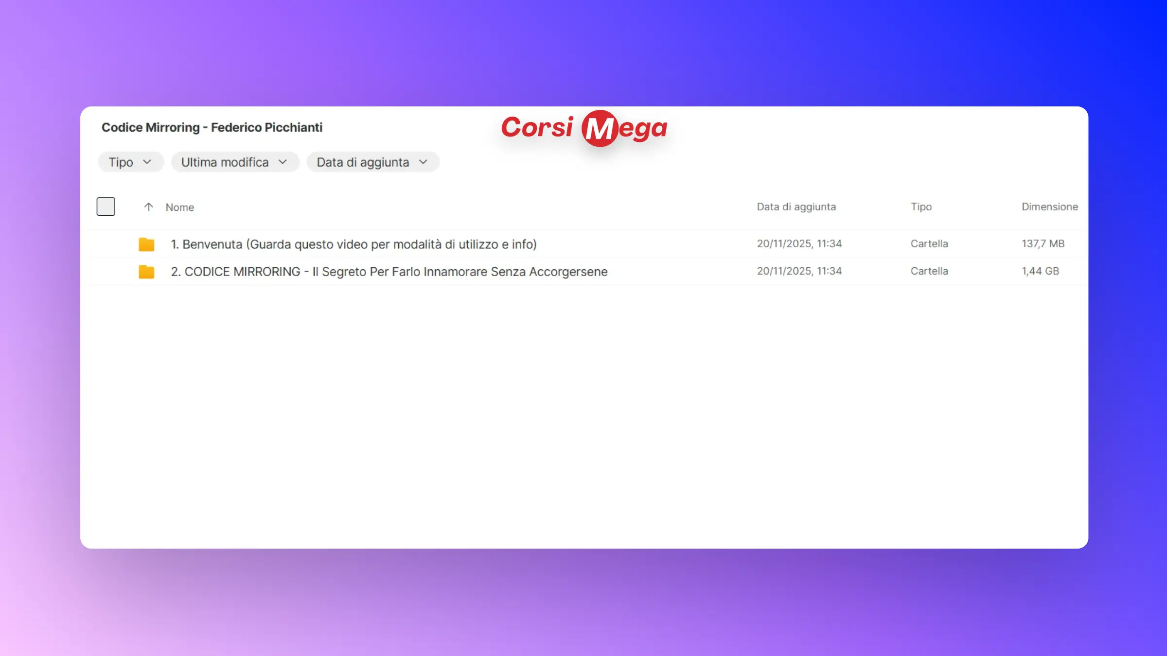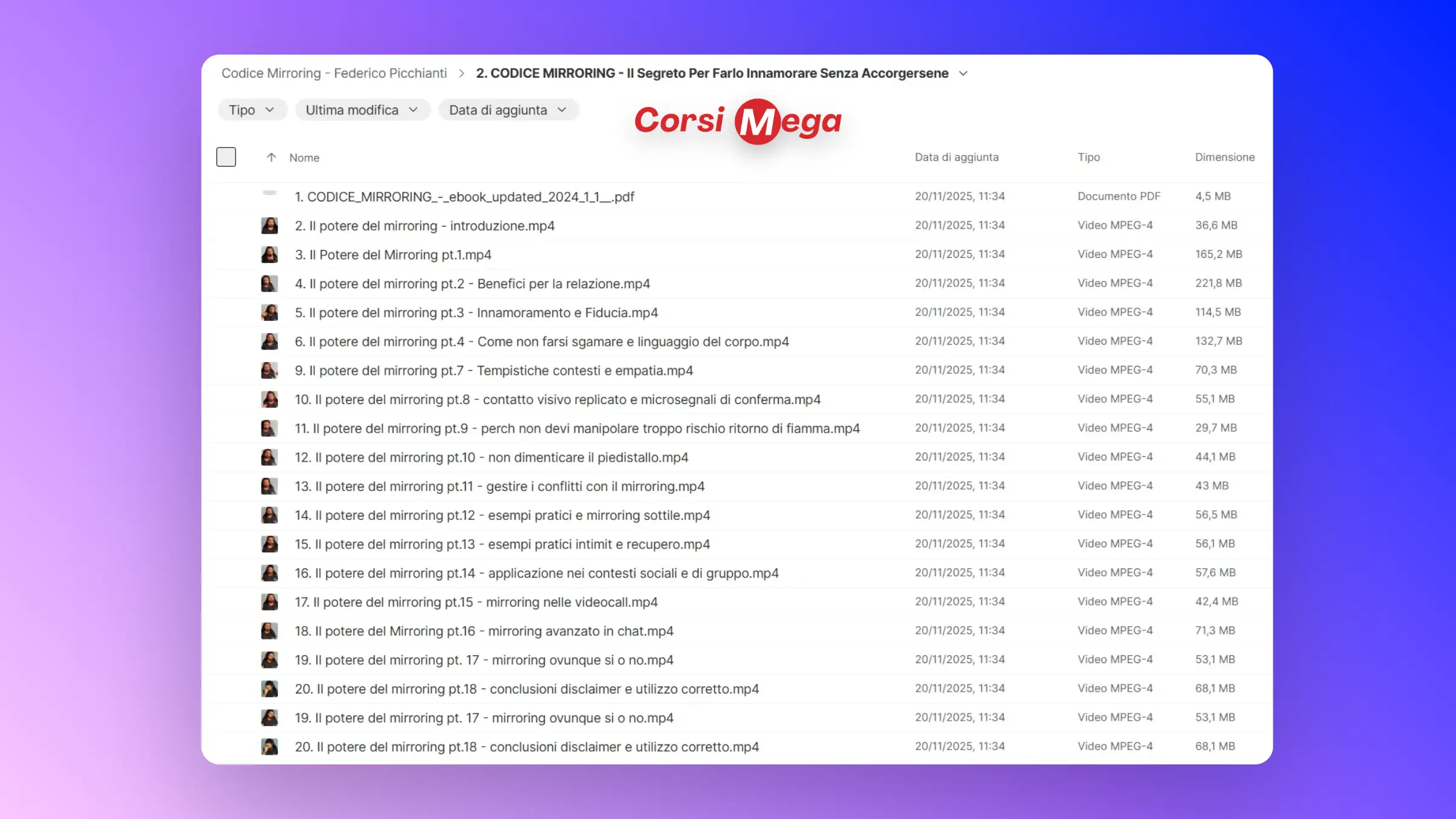 “Codice Mirroring” è un percorso avanzato dedicato a chi desidera comprendere a fondo le dinamiche relazionali e imparare a comunicare in modo più empatico, naturale ed efficace. Attraverso un metodo strutturato, Federico Picchianti guida passo dopo passo alla scoperta del mirroring, una tecnica psicologica studiata e utilizzata in comunicazione, leadership e relazioni interpersonali per creare sintonia autentica.