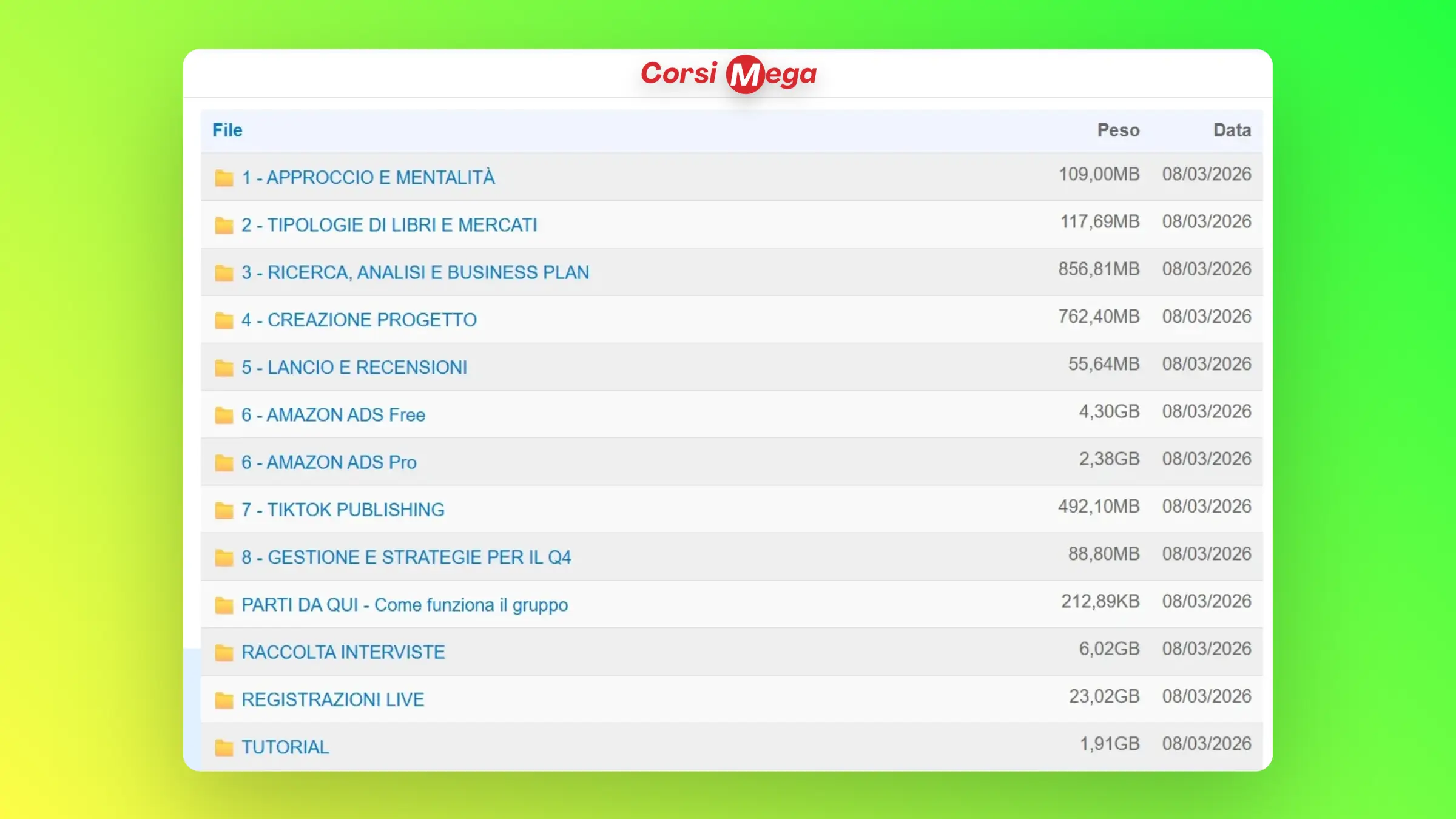 NOTA: salvo dove specificato, non riceverai i materiali cartacei, l’accesso ai gruppi social, dirette live non registrate, licenze non condivisibili, consulenze o l’assistenza da parte dell’autore del corso. Per maggior informazioni ti invitiamo a consultare le FAQ o a contattarci direttamente.