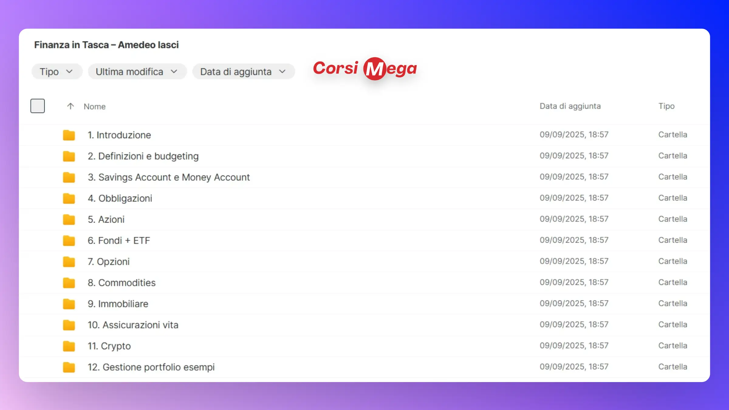 Questo corso non è solo una raccolta di informazioni, ma una guida dettagliata e completa, arricchita da risorse, podcast di esperti e una community privata. Impara a gestire le tue finanze e inizia a costruire il tuo futuro finanziario, seguendo il percorso che ho strutturato per te. Ti accompagnerò passo dopo passo, affrontando argomenti fondamentali come obbligazioni, azioni, criptovalute, immobiliare e molto altro.