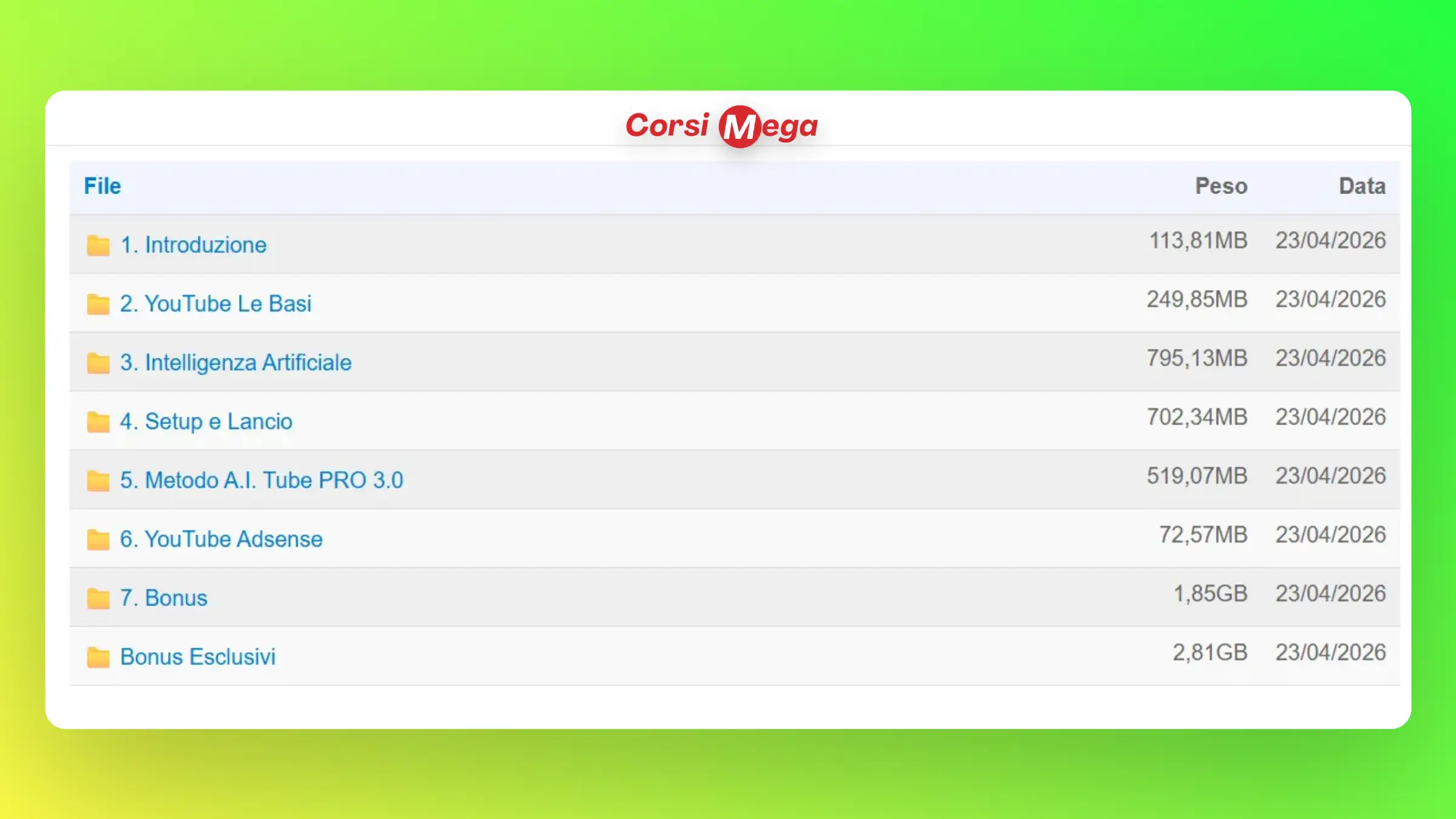 Acquistando questo prodotto otterrai accesso a tutti i video, file e contenuti digitali del corso 100% completi e aggiornati. Potrai scaricarli subito dopo il pagamento e consultarli offline sul tuo computer. Dai una sbirciata agli screenshot sopra per avere un’anteprima di quello che troverai all’interno del corso!