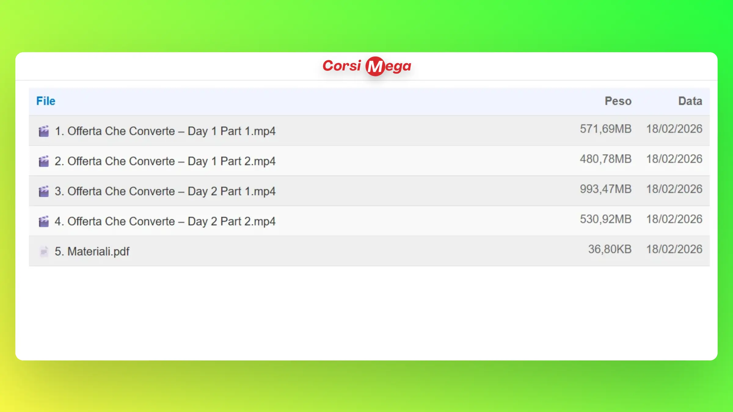 Acquistando questo prodotto otterrai accesso a tutti i video, file e contenuti digitali del corso 100% completi e aggiornati. Potrai scaricarli subito dopo il pagamento e consultarli offline sul tuo computer. Dai una sbirciata agli screenshot sopra per avere un’anteprima di quello che troverai all’interno del corso!