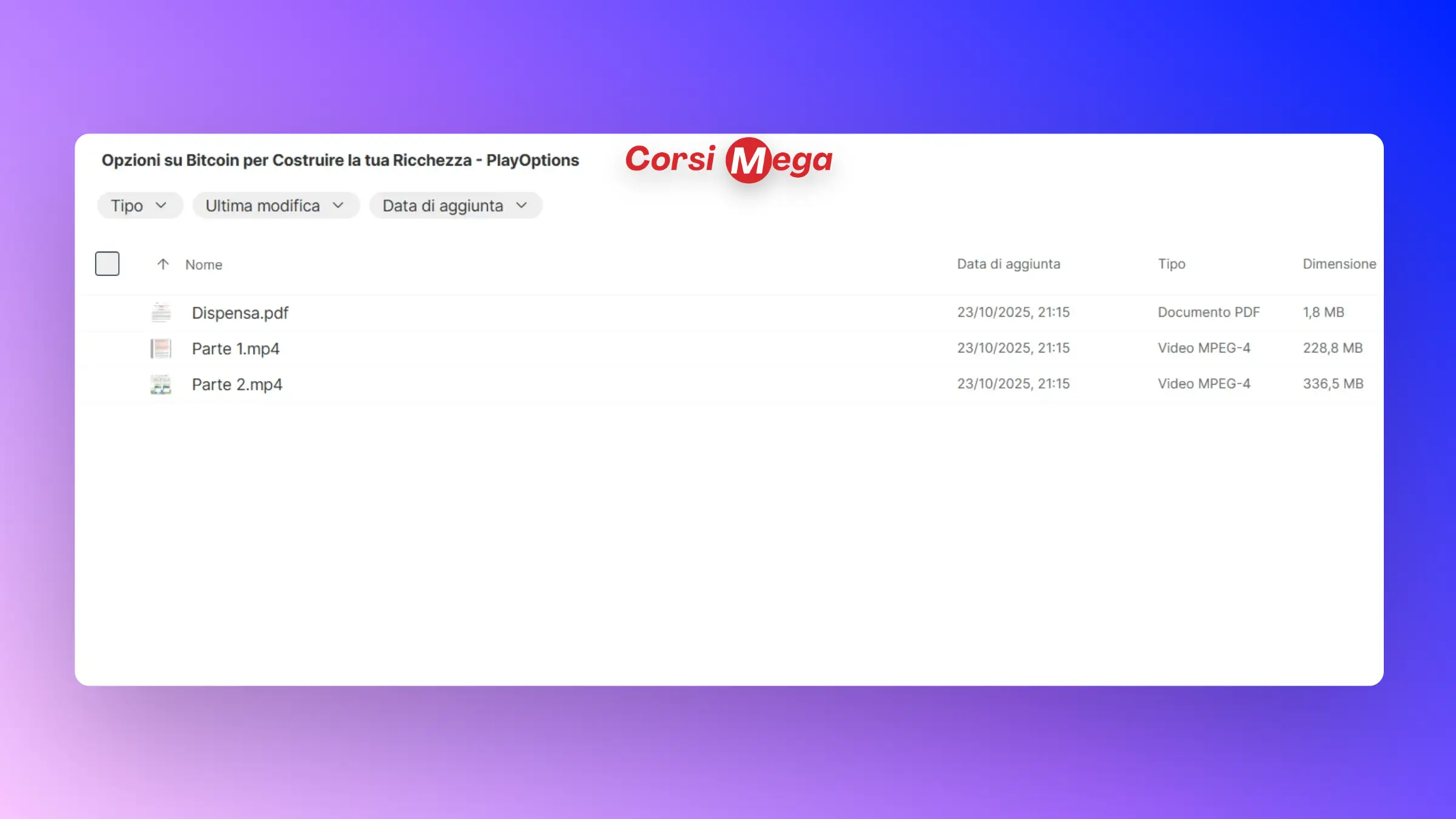 Acquistando questo prodotto otterrai accesso a tutti i video, file e contenuti digitali del corso 100% completi e aggiornati. Potrai scaricarli subito dopo il pagamento e consultarli offline sul tuo computer. Dai una sbirciata agli screenshot sopra per avere un’anteprima di quello che troverai all’interno del corso!