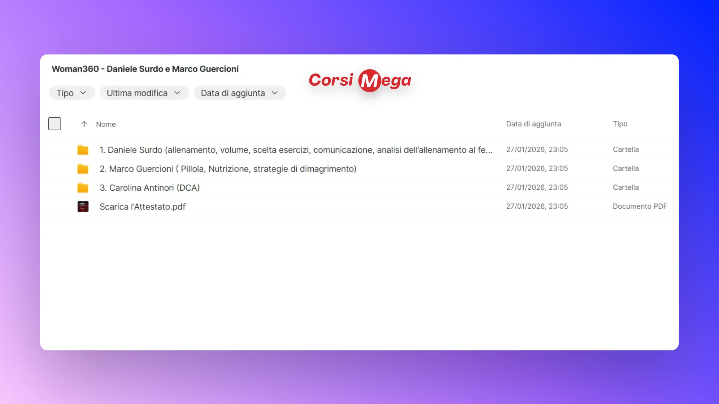 Guidato dagli esperti Daniele Surdo e Marco Guercioni, Womans360 ti offre un percorso unico per comprendere a fondo le differenze tra uomo e donna nell’allenamento, gestire al meglio ciclo mestruale, stress e alimentazione, e creare programmi efficaci e personalizzati.